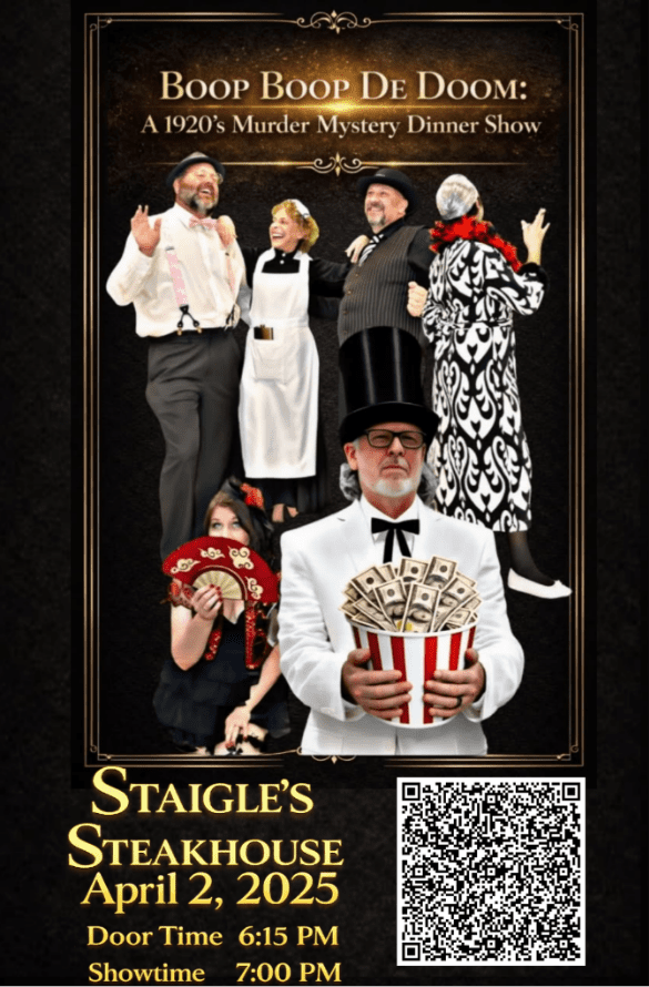 You’re invited to an unforgettable night featuring a four-course chef-curated dinner paired with the interactive Boop Boop De Doom: A 1920’s Murder Mystery Dinner Show Staigle’s Steakhouse Wiggins on April 2, 2026.